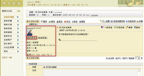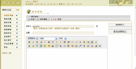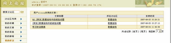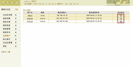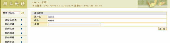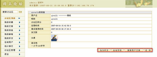 查看好友信息第一步:点击左侧导航栏的“我的好友”,进入好友列表,列表包括好友的用户名、昵称、最新登陆时间和IP以及好友说明。 第二步:点击某个好友的用户名,进入查看信息页面。 第三步:点击“给他写信”按钮,给该好友发送站内邮件;点击“搜索用户文章”按钮,查看该好友的发表文章列表,点击某文章标题进行浏览。 图 4 察看好友信息 图 4 给好友写信 图 4 查看好友的文章列表 删除好友第一步:点击左侧导航栏的“我的好友”,进入好友列表,列表包括好友的用户名、昵称、IP和最新登陆时间以及好友说明。 第二步:通过复选框选择要删除的好友。 第三步:点击“删除”按钮。 第四步:弹出对话框“是否确认删除选中项目?”,点击“确认”完成删除操作,点击“取消”则取消删除操作 |