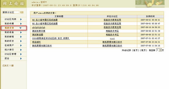 第一步:点击左侧导航栏的“我的文章”,进入我的文章列表。文章列表包括文章标题、文章所在讨论区和发表时间。